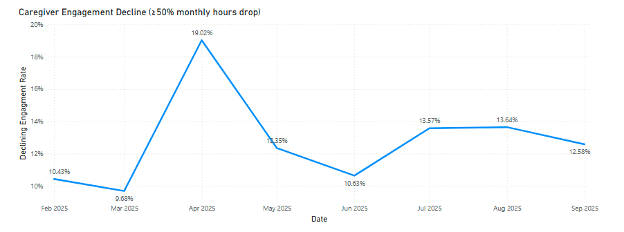 Caregiver Engagement Decline (≥ 50% Monthly Hours Drop): This indicator measures caregiver engagement over a 7-month period by tracking the share of active caregivers who experience significant reductions (50% or more) in work hours. By using a 50% threshold, the metric filters out minor outliers and identifies whether engagement decline represents true disengagement trends or temporary disruptions.