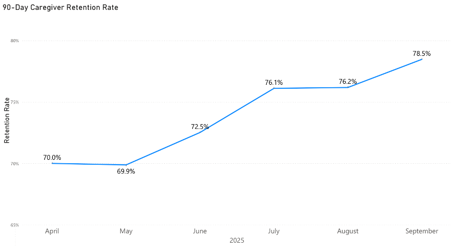 Why we measure it: Retention is a critical indicator of workforce stability and agency performance. High caregiver turnover can disrupt care delivery, increase recruitment costs, and reduce caregiver morale. By measuring the 90-day retention rate, agencies can identify challenges in onboarding, engagement, and work distribution for new caregivers.